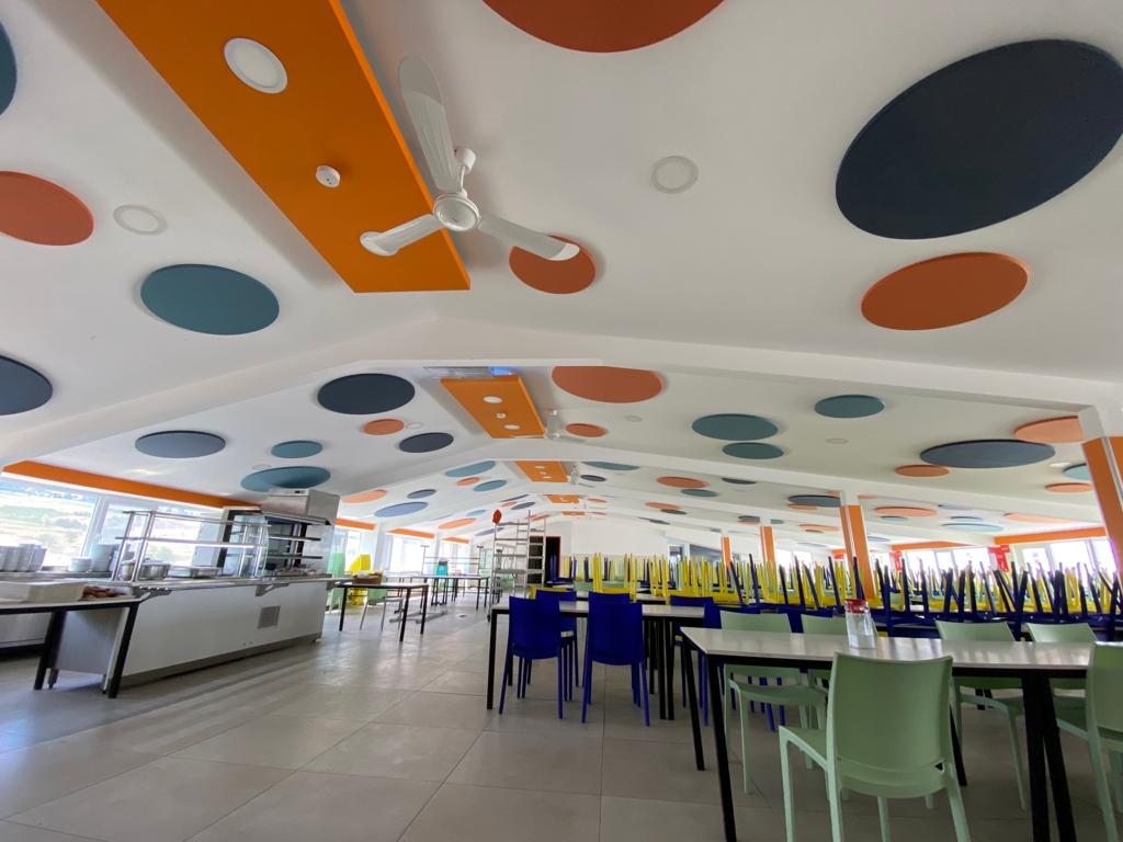 - Tavanda yüzer akustik paneller veya baffle sistemleri