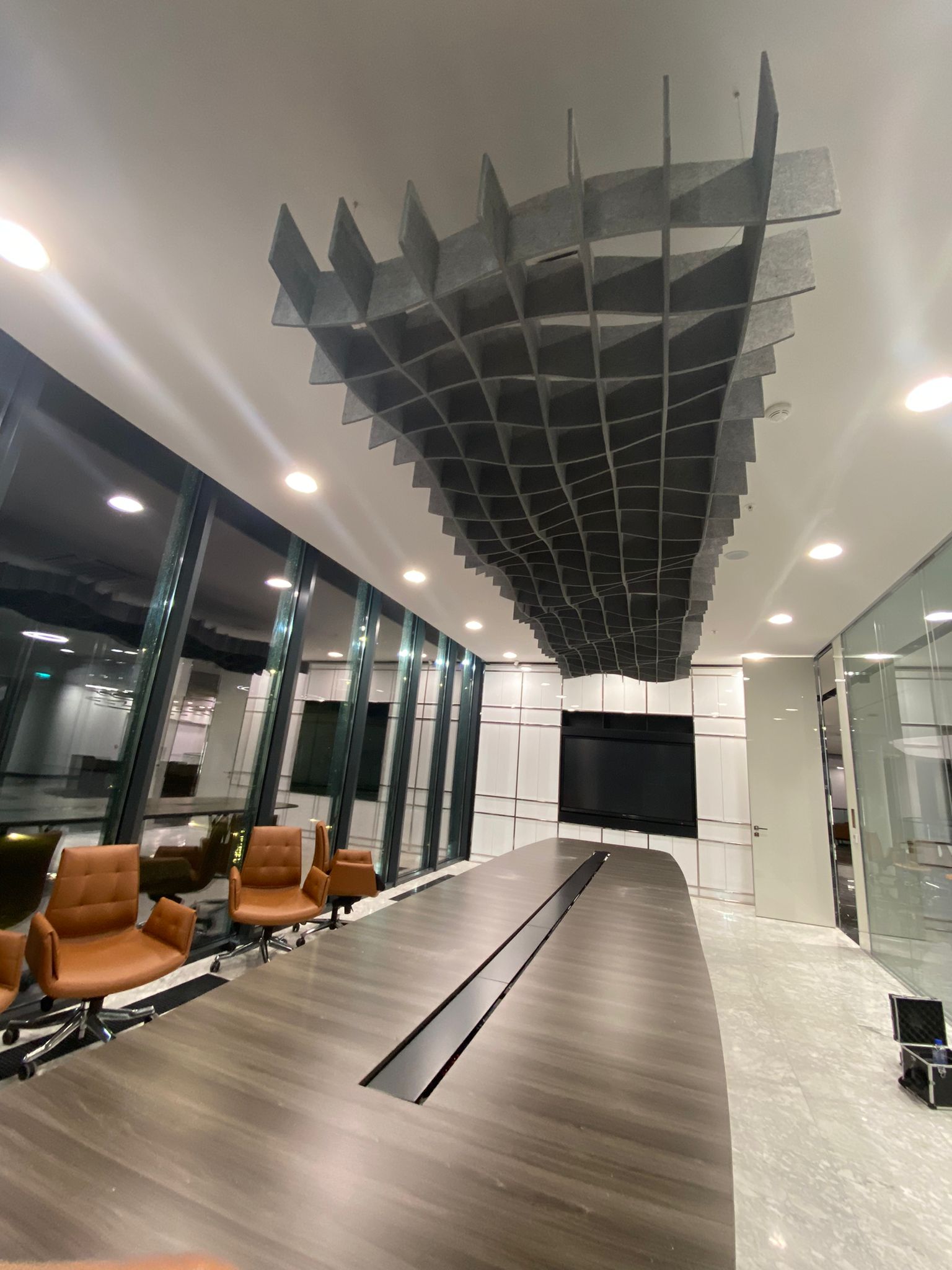 Toplantı sırasında yankı veya uğultu oluşursa, konuşmaların netliği bozulur ve iletişim kalitesi düşer. Akustik düzenleme sayesinde:
